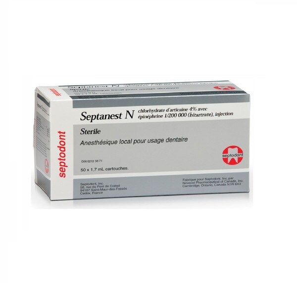 Septodont Septanest N, Articaine HCl 4% with 1:200,000 Epinephrine Injection, 50 per Box 99146